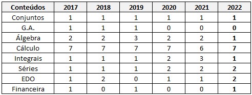 Os conteúdos da prova de Matemática são mais “concentrados” do que os conteúdos de outras provas; normalmente 7 das 15 questões entram na categoria de “Cálculo”, que envolve funções de uma ou mais variáveis, compreendendo questões envolvendo cálculo de limites, derivadas e otimização. Saber bem este conteúdo é essencial (mas não menos desafiante), visto que ele “abre” a parte de integração, séries e sequências e equações diferenciais e em diferenças, totalizando assim aproximadamente 73% do conteúdo das últimas provas. Além disso, derivadas e otimização são essenciais na resolução de muitas das questões mais avançadas das provas de Micro, Macro e Estatística.