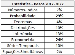 Cabe ressaltar que nos últimos anos o conteúdo de Econometria passou a cair menos; as questões de Números Índice se tornaram mais comuns, e o conteúdo de Equações Simultâneas não cai desde o exame 2014. Apesar de sua importância geral para a ciência econômica, recomendaria o estudo de Simultâneas somente como o último dos conteúdos, se houver tempo.